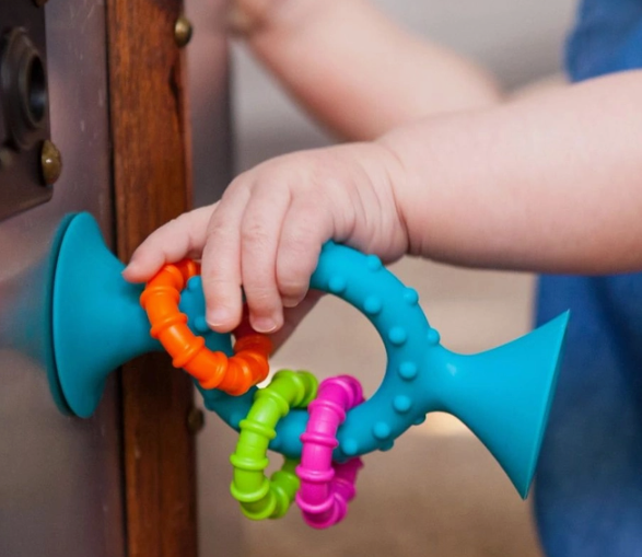 Little explorers can’t help but get sucked into the sensory excitement of these bendy, rattly, chewy, suction-cup creations! Their vivid textures instantly inspire little fingers to grab and feel while their soft silicone material simultaneously makes them perfect for soothing sore gums. Flip and spin the textured, plastic rings to hear them rattle brightly. Press their suction cups onto any smooth, non-porous surface to set up a stationary play space and then pull them off to hear their loud and exciting POP. They’re sure to become baby’s new favorite toy! No matter which one you choose, early playtime learning really sticks when little ones start exploring with the pipSquigz Loops.