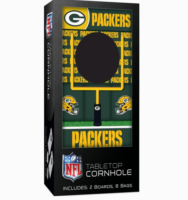 Bring the thrill of the game right to your table with the Green Bay Packers Tabletop Cornhole set, the perfect addition for any fan. Each set features two wooden boards decked out in the iconic team colors, proudly displaying the official logo for an authentic look. Whether you’re tailgating, enjoying a family gathering, or just showing off your team pride, this game set is guaranteed to bring out the competitor in everyone. Included in the set are eight premium mini bean bags emblazoned with the team logo and colors. The compact design, it’s the perfect size for both portability and playability. Whether you’re challenging friends, family, or fellow fans, the Green Bay Packers Tabletop Cornhole set promises endless hours of fun and team spirit. Includes two 10" x 5" boards and eight 2” x 2” bags. Get ready to score big with this officially licensed NFL product!