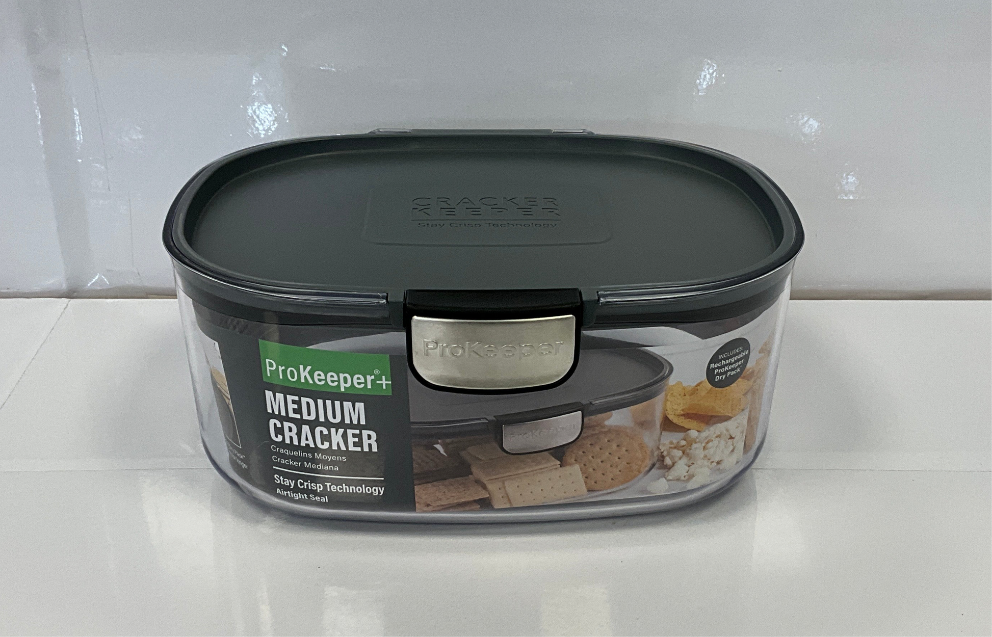 Designed with Stay Crisp Technology, the Medium Cracker ProKeeper+ keeps your snacks fresh and crispy for longer. The Prokeeper Dry Pack is rechargeable and helps maintain low humidity for the ideal storage environment. The 3 Qt (2.8 L) size is stackable for space-saving storage and dishwasher safe for easy cleanup.